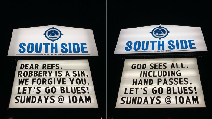 South Side Church of God in Sappington put up two signs calling out the Sharks and the refs!