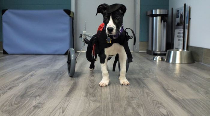 A 4-month-old puppy with paralyzed legs is learning how to walk so she can be adopted to her forever home.
